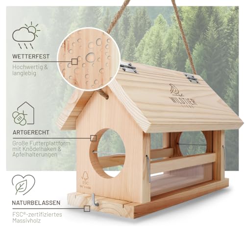 LANGLEBIG & WETTERFEST – Unser wildtier liebe Vogelfutterhaus ist aus wetterfestem, naturbelassenem Holz hergestellt. Es besteht aus einer großen Plattform für Vogelfutter, zwei Apfel-Haltern und einem Meisenknödelhalter